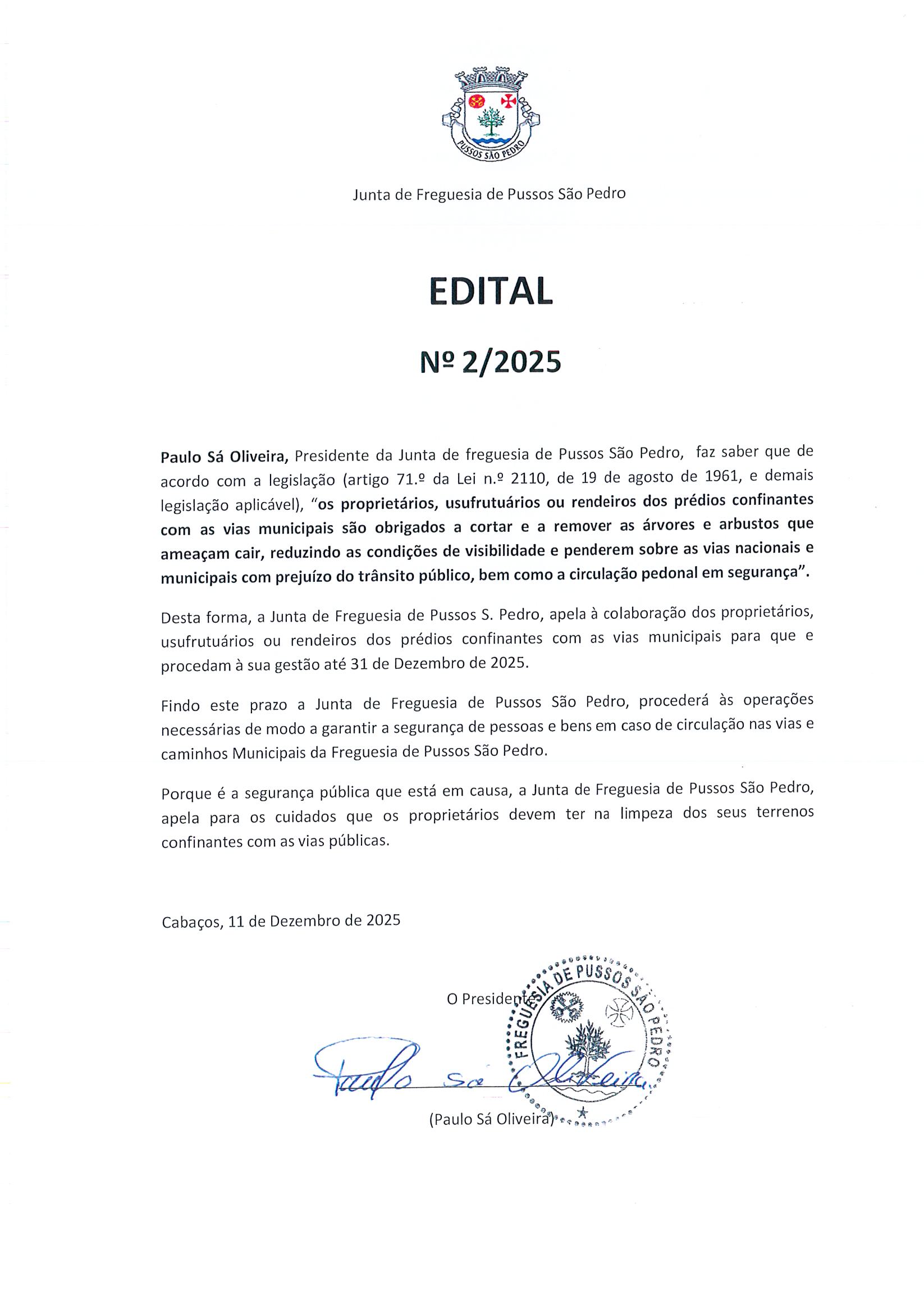 É com muito orgulho e estima, que me dirijo a todos vós na qualidade de Presidente da Junta de Freguesia de Pussos São Pedro, para o mandato autárquico 2025-2029.